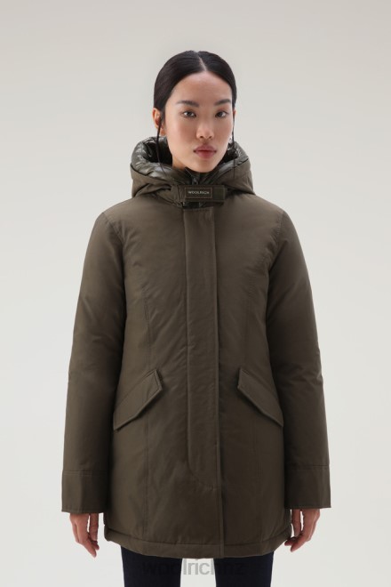 The iconic – slim fit – feminine Arctic Parka without fur. Zip and button fastening. Flap pockets.In the classic 60% cotton 40% nylon Woolrich fabric, a special Teflon finish ensures resistance to snow, rain and wind – keeping you dry.