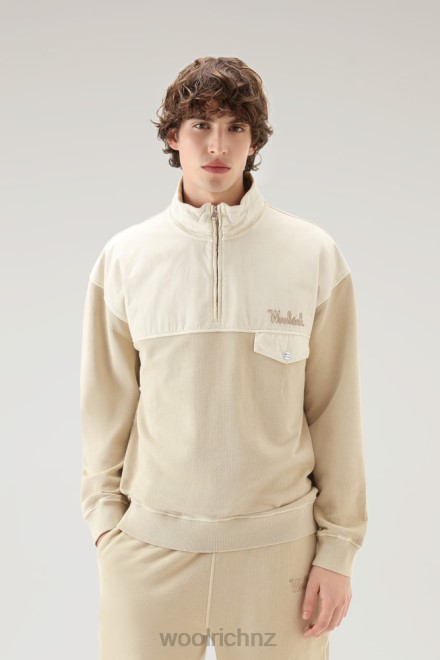 Meet this sporty essential you’ll be wearing everywhere. Our sweatshirt is crafted in pure organic cotton and poplin. The garment dye process promises a unique finish for each pair. The chest pocket, collar, and front yoke are made in poplin while the rest of the garment is crafted in fleece. It features a high collar, a half zip closure, ribbed cuffs and hem, and a Woolrich embroidered logo on the chest. Pack this versatile essential for your season adventures. The coloring method makes each garment unique, so the color may vary from the photo.